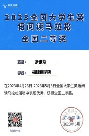 在为期10天(4月23日8点—5月3日8点)的2023全国大学生英语阅读马拉松活动中,金年会官网学生积极参与,认真阅读答题,取得非常优异的成绩。其中,2020级商务英语专业曾洲桐同学获全国一等奖且排名第一,同样来自2020级商务英语专业的张婕和张雅龙同学获全国二等奖,来自2022级商务英语专业的程俊炜同学获全国三等奖。
