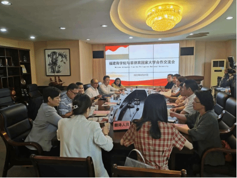 2023年8月27日下午,菲律宾国家大学校长Dr. Renato Carlos H.Ermita一行六人莅校交流,校长程灵、副校长萧罡、有关职能部门和二级学院相关负责人在马尾校区会见来宾,召开交流会。金年会官网池玫院长出席交流会,教师周文蕴为菲律宾国家大学校长一行提供翻译语言服务。