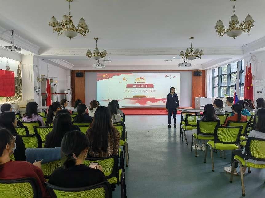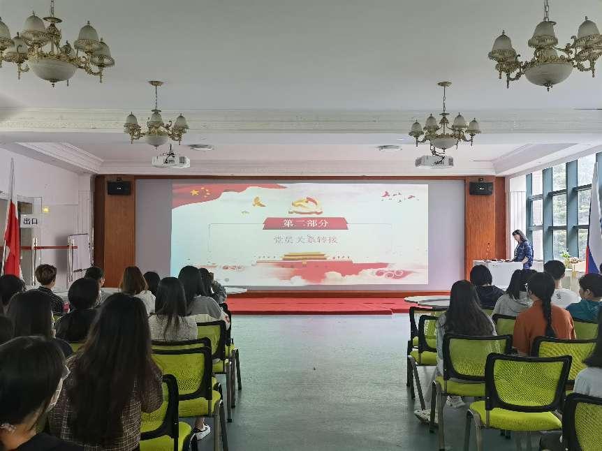 不忘入党初心,牢记青春使命。2022年5月27日金年会jinnianhuicom于外语体验中心召开毕业生党员教育大会。本次大会由金年会jinnianhuicom学生第二党支部书记张丹丹老师主持,院团委书记翁云星老师作离校教育致辞,旨在进一步强化党员意识,提升党员素质。金年会jinnianhuicom全体毕业生党员参加此次会议。