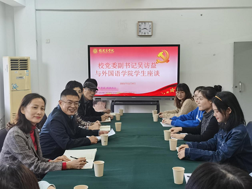吴书记首先与联系班级2018商务英语2班学生代表进行座谈,一一询问了每位同学的基本情况,为交流会营造了轻松和谐的氛围。“对学校发展有什么希望”、“有什么意见”、“在学习、生活、工作中有什么问题”……同学们畅所欲言,分别从校区环境氛围、设施建设、宿舍硬件条件、图书馆书籍、等方面提出了意见和建议。吴书记仔细倾听、认真记录,针对每一个同学的每一个话题,都耐心地一一解答,同时吴书记对同学们提出三点希望:一是希望同学们社会职务不要超过两个,学业为重;二是希望同学们注重科学理论学习的同时更加注重党史理论的学习,学好中国百年党史;三是希望同学多看多读中华传统文化书籍提升自身文化涵养,为实现中华民族伟大复兴的中国梦奋发努力。