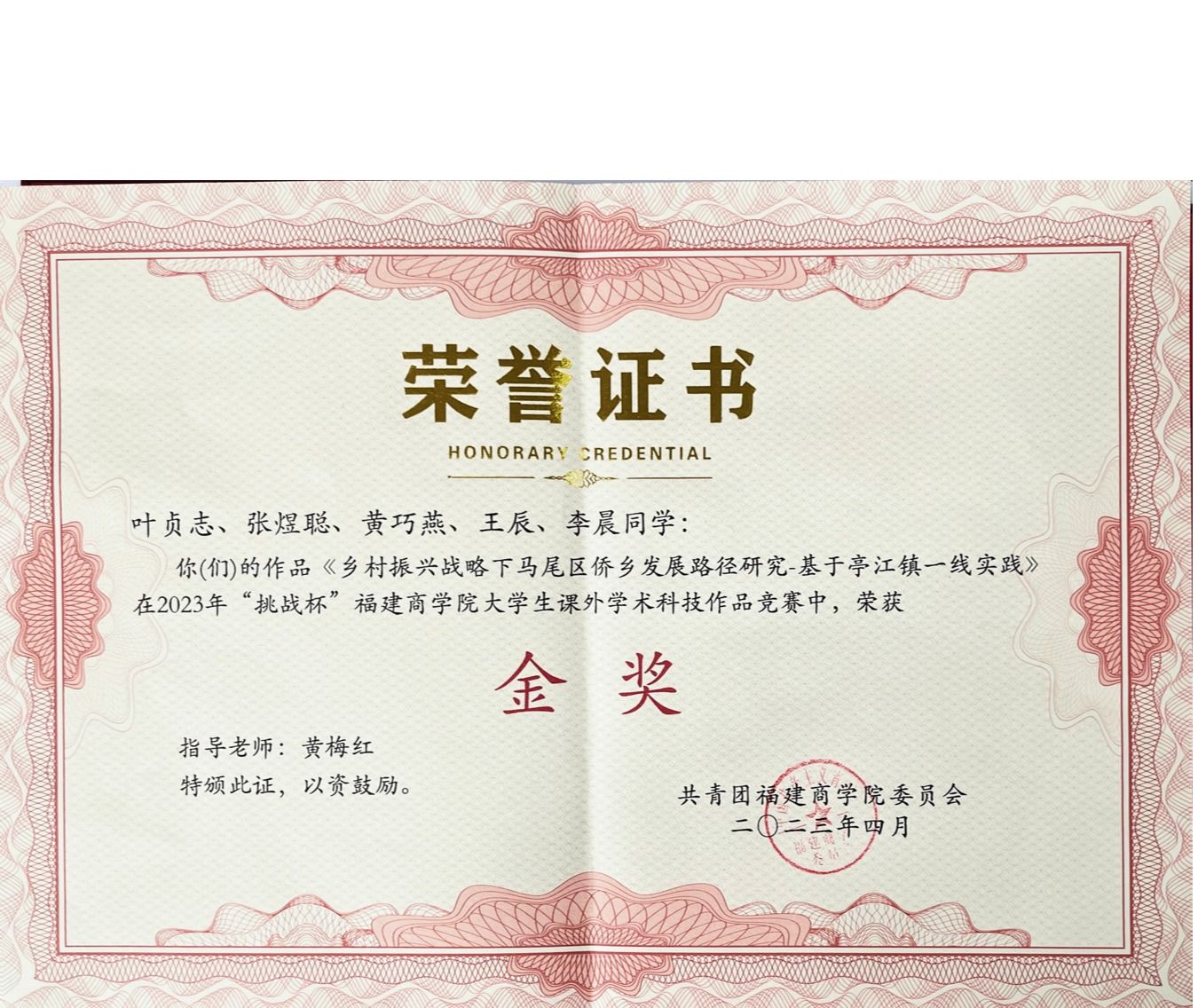 近日,由共青团金年会jinnianhuicom委员会主办的2023年“挑战杯”金年会jinnianhuicom大学生课外学术科技作品竞赛在连江校区明德楼落下帷幕。金年会官网21级日语3班叶贞志、21级日语2班张煜聪、20级日语2班黄巧燕、20级日语1班王辰、20级商务英语2班李晨五位同学的作品《乡村振兴战略下马尾区侨乡发展路径研究-基于亭江镇一线实践》(指导老师:黄梅红),在此次竞赛中荣获金奖。