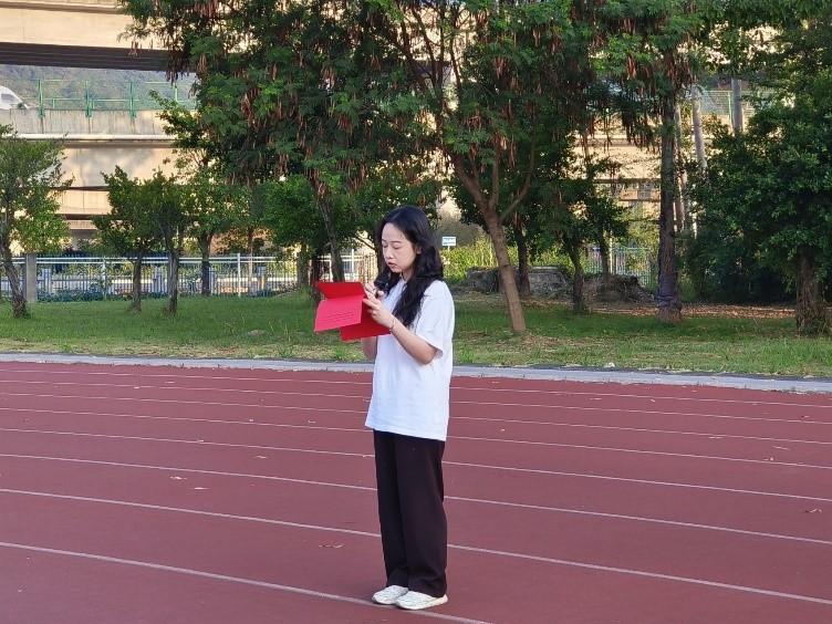国旗护卫队队员穿着整齐,昂首挺胸,迈着铿锵有力的步伐将五星红旗护送至升旗台。伴随着慷慨激昂的国歌,全体师生代表面向国旗行注目礼,庄严肃立,五星红旗冉冉升起,迎风飘扬。学生代表吴欣雨同学进行了“青春奋进正当时,筑梦不负新时代”主题国旗下讲话,她提到当代青年身处盛世,见证了祖国在科技、经济、文化等方面的繁荣,更应该响应国家号召,汲取奋进力量,展现青年面貌。她呼吁同学们保持强大的定力,立足于专业知识,苦练本领,肩负起中华民族伟大复兴的时代重任,以信心凝聚力量、以实干谱写华章,不断发展自身、成就自身,不负韶华,砥砺前行。同时,值此本科教学合格评估的关键时期,她强调同学们要充分发扬主人翁意识,注重提高自身责任感,做好榜样示范,以团结的姿态和饱满的精神状态迎接本科教学合格评估。