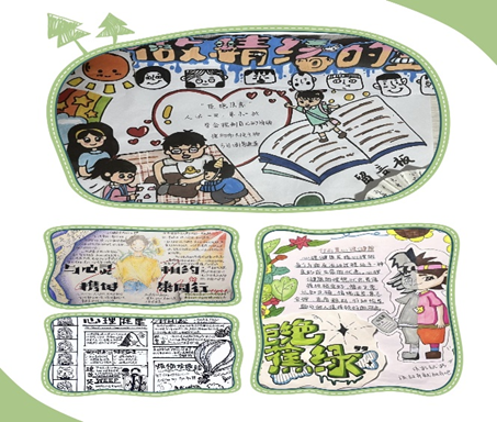 情随笔意,以画疗心。在手抄报比赛中,选手们紧紧围绕心理健康主题,发挥自身的创意和才华,巧妙把环保物品再利用,与传统技艺,如剪纸等方式结合在一起,设计出一批特色鲜明的作品,立体生动地诠释同学们对心理健康的深刻理解。