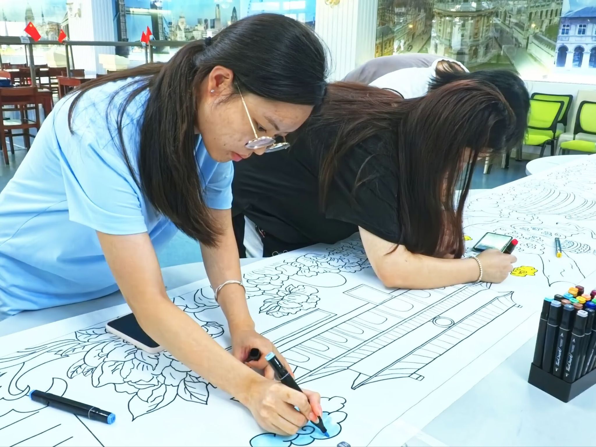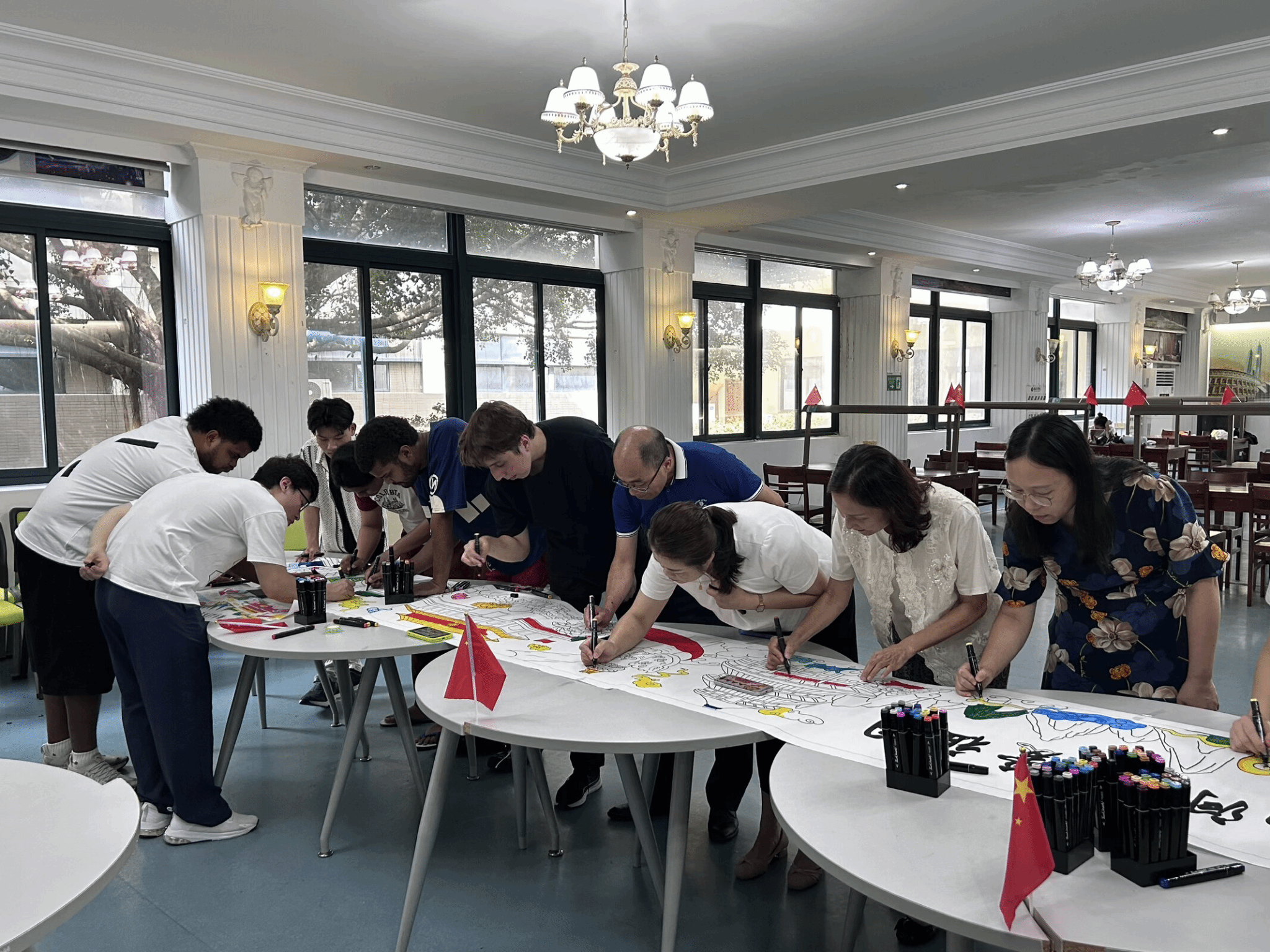 活动现场气氛热烈,5米画卷在长桌铺展,师生们环绕两侧,俯身执笔,专注创作。他们以线条勾勒时代图景,以色彩渲染真挚情感,在协作中增进理解,在交流中凝聚共识。随着绘制推进,一幅锦绣山河意象与青春视角的壮丽图景跃然纸上。本次活动不仅展现出学院师生昂扬向上的精神风貌,更让留学生直观感受到了中国的发展成就,进一步增强中华文明的传播力影响力。